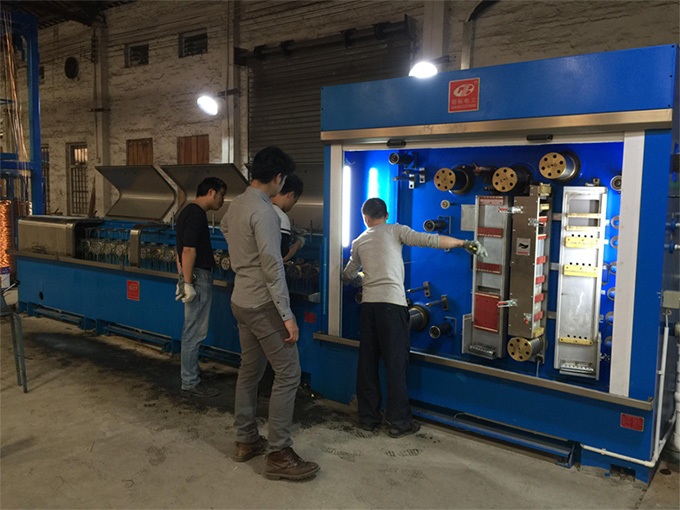 上面兩張圖片是我司技術工程師在廣東佛山某電纜廠拍的,因為當時我們主要是在現場調試后面的收卷部分,也是難點的一部分,所以就拍了收卷輪和跳舞輪的圖片。當時現場的收卷電機是三相異步電動機,功率為15KW,采用18.5KW的FC360頻器進行控制。變頻器外接設備上檢測跳舞輪位置的滑動電阻,作為反饋跳舞輪位置的反饋信號;外接通過PLC 前饋計算后的模擬量輸出作為前饋信號。