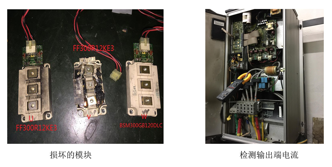案例二:客戶反映故障報警“AL15”,為二次側(cè)電源故障,維修二次側(cè)電源電路。修好后現(xiàn)場裝機(jī)試機(jī),檢測輸出側(cè)三相電源電壓平衡正常,輸出頻率45HZ時三相輸出電流為135A左右正常。連續(xù)運(yùn)行3小時左右時變頻器發(fā)生故障停機(jī),現(xiàn)場檢測電源驅(qū)動板未發(fā)現(xiàn)損壞,開關(guān)電源供電電路正常,驅(qū)動電路6路未發(fā)現(xiàn)短路、開路現(xiàn)象。V相IGBT模塊損壞(型號為 FF300R12KE3),U、W 正常。