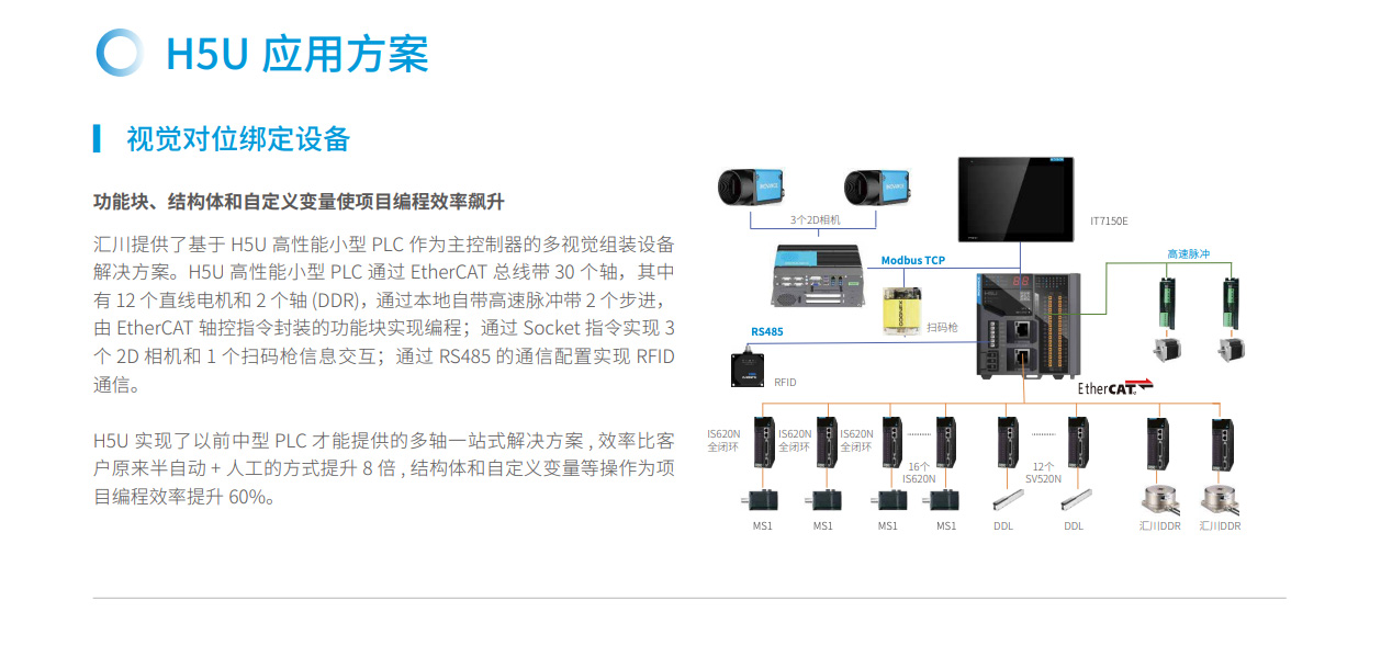 匯川技術(shù)推出首個應(yīng)用EtherCAT 總線的小型PLC H5U,讓線體設(shè)備飛速運轉(zhuǎn)。隨著終端消費日趨升級,生產(chǎn)制造面臨巨大的壓力,而H5U 能夠簡化布線量、加快編程調(diào)試時間、滿足帶軸能力的要求以及嚴(yán)苛的成本控制需求,從容應(yīng)對嚴(yán)峻的挑戰(zhàn),是將EtherCAT總線應(yīng)用到小型PLC 的先鋒之作。