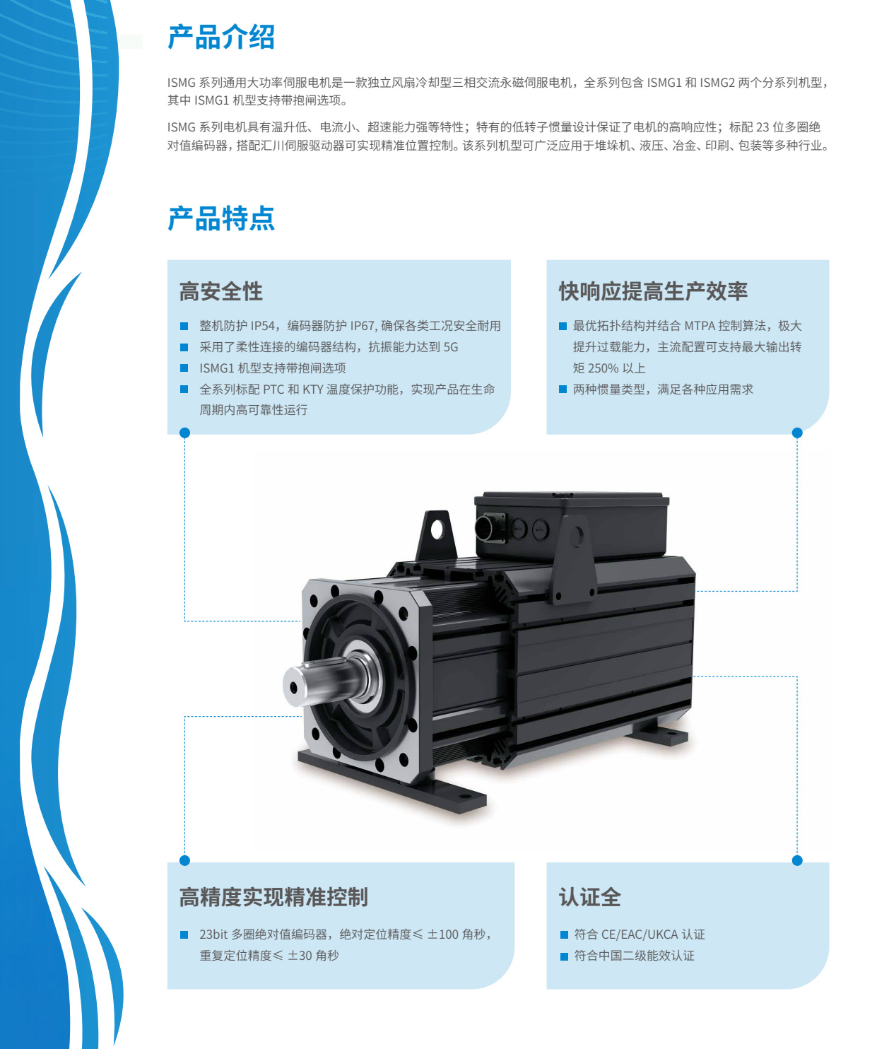 ISMG系列伺服電機產品,功率覆蓋7.5 kW ~ 80 kW、標配23 位絕對值編碼器;產品的IP54 防護等級設計、耐沖擊振動的編碼器結構設計保證了產品可以覆蓋絕大多數工業場合的應用;獨特的電磁設計及風冷回路設計、內置熱保護器,實現了產品在生命周期內高可靠性運行;ISMG1系列亦可加裝150 N·m 制動扭矩的制動器。